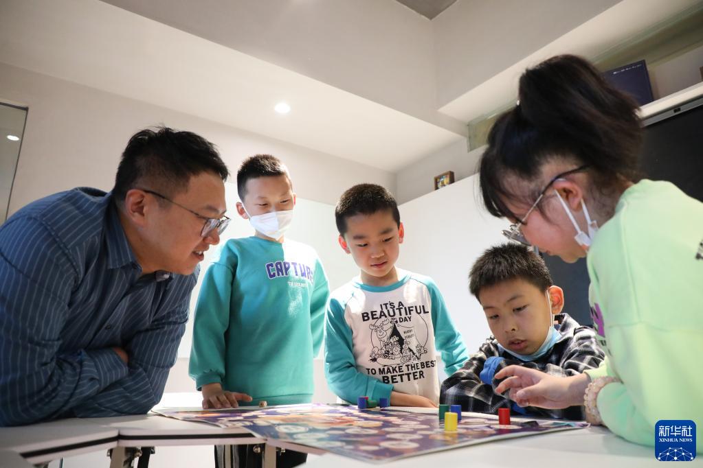 4月1日,在甘肅省蘭州市的讀者出版集團數(shù)字閱讀中心讀者小站,工作人員與小朋友一起玩“講述中國神話故事”的飛行棋游戲。新華社記者 馬希平 攝