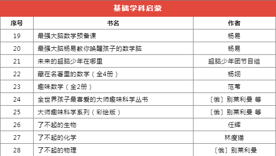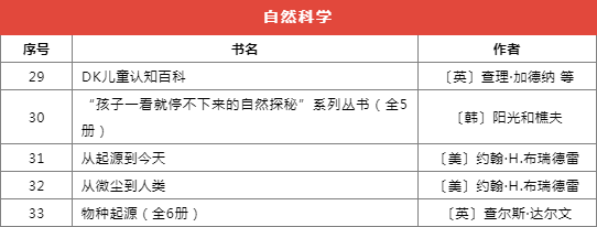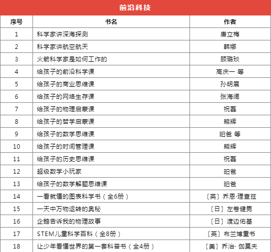 推薦書目種類繁多,分為前沿科技、基礎(chǔ)學(xué)科啟蒙、自然科學(xué)、家庭教育等十個(gè)類別,共計(jì)173本(套)。