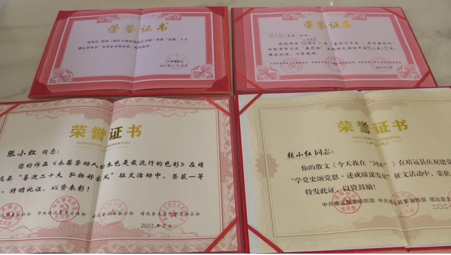一分耕耘,一分收獲,機(jī)會(huì)總給有心人。如今,張小紅加入了靖遠(yuǎn)縣作家協(xié)會(huì)、白銀市作家協(xié)會(huì)、白銀市文藝評(píng)論家協(xié)會(huì)成為了會(huì)員,也增選為靖遠(yuǎn)縣政協(xié)委員。她的作品散見于《白銀文學(xué)》《烏蘭》等報(bào)刊雜志以及“靖遠(yuǎn)作協(xié)”“隴上風(fēng)情”“黃土情文學(xué)”等文學(xué)公眾號(hào);部分作品榮獲靖遠(yuǎn)縣建黨100周年“學(xué)黨史頌黨恩·述成績(jī)謀發(fā)展”征文二等獎(jiǎng),“喜迎二十大·教壇著華章”《未來導(dǎo)報(bào)》有獎(jiǎng)?wù)魑膬?yōu)秀獎(jiǎng)等……