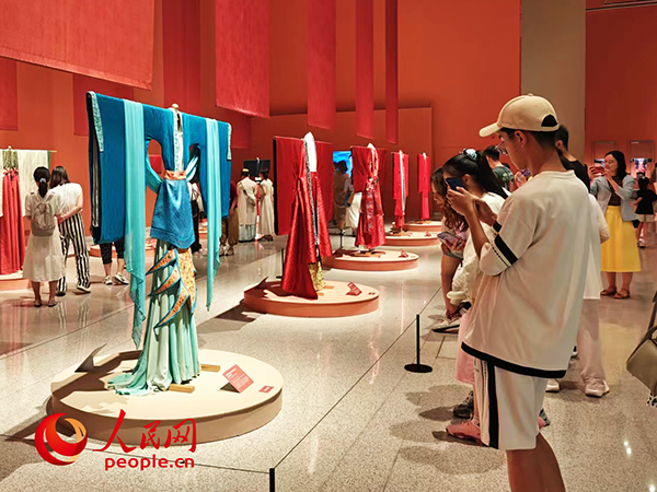 7月20日,正值周末,中國工藝美術(shù)館(中國非物質(zhì)文化遺產(chǎn)館)“五彩錦簇——中華服飾文化展”的展廳里人流如織。有人舉起手機(jī)拍照留念,有人駐足了解精湛的織造工藝,還有人在與同伴討論哪里能買到“同款”衣裝……這場中華服飾的視覺盛宴,讓眾多游客沉浸其中。