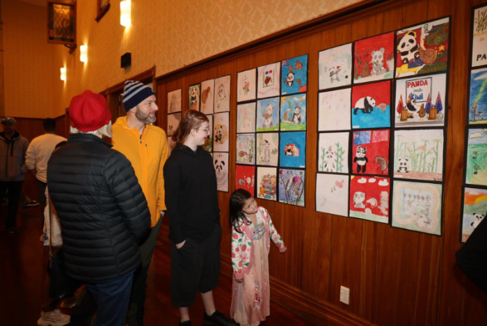 8月10日,在新西蘭懷帕市,人們在2024中國主題圖書展暨“大熊貓遇見幾維鳥”中國新西蘭國際青少年藝術展上參觀。新華社發(fā)(孫學良攝)