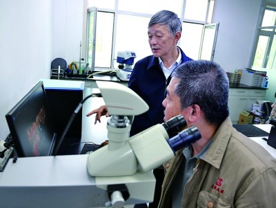 9月26日,敦煌研究院院長蘇伯民(左)與同事一起在實(shí)驗(yàn)室觀察實(shí)驗(yàn)數(shù)據(jù)。
