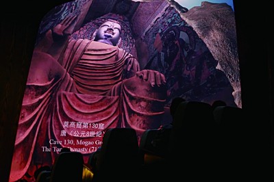 數(shù)字電影為游客欣賞敦煌藝術(shù)提供了全新的視覺體驗(yàn)。圖為7月26日,游客在敦煌莫高窟數(shù)字展示中心欣賞球幕電影《夢幻佛宮》。