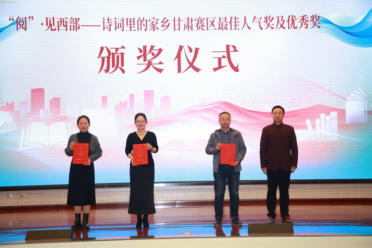 閉幕式上公布并表彰了“優(yōu)秀閱讀推廣活動案例獎”獲獎人員、“‘穿越古今·夢回隴右’詩詞大賽優(yōu)秀組織獎”獲獎人員、“‘閱·見西部’第一季——‘詩歌里的家鄉(xiāng)’(甘肅賽區(qū))最佳人氣獎和優(yōu)秀獎”獲獎人員。