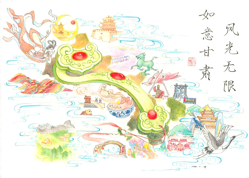 筆者作為編者之一,在一開(kāi)始接觸到“如意甘肅”這個(gè)概念時(shí),就感受到了一種撲面而來(lái)的畫(huà)面感和強(qiáng)烈的色彩張力,而在精讀《如意甘肅》的過(guò)程中,這種感覺(jué)愈發(fā)清晰和強(qiáng)烈,一幅黃土高原、廣袤草原、茫茫戈壁、潔白冰川為底色,十四個(gè)市州的人文自然美景簇?fù)憝h(huán)繞,一柄通體翠綠、晶瑩無(wú)瑕的“玉如意”居中凝型,璀璨奪目的文化如點(diǎn)點(diǎn)紅寶石鑲嵌其中的構(gòu)圖呼之欲出。隨著理解認(rèn)識(shí)的逐步深入,本書(shū)喚起了我的思想共鳴和對(duì)家鄉(xiāng)深沉熱烈的情感流動(dòng),并繪制了這幅印象畫(huà),以填補(bǔ)文字和語(yǔ)言所不能盡興之處。我真切地希望,隨著《如意甘肅·甘肅省情研究》的發(fā)行和推廣,隨著美好甘肅的不斷發(fā)展和進(jìn)步,在未來(lái),人們心中的甘肅,不再是“苦瘠甲于天下”的荒涼意象,而是這柄溫潤(rùn)澄澈、莊重堅(jiān)實(shí)的“玉如意”,和圍繞著、托舉著它的那些繽紛美景和璀璨文化!