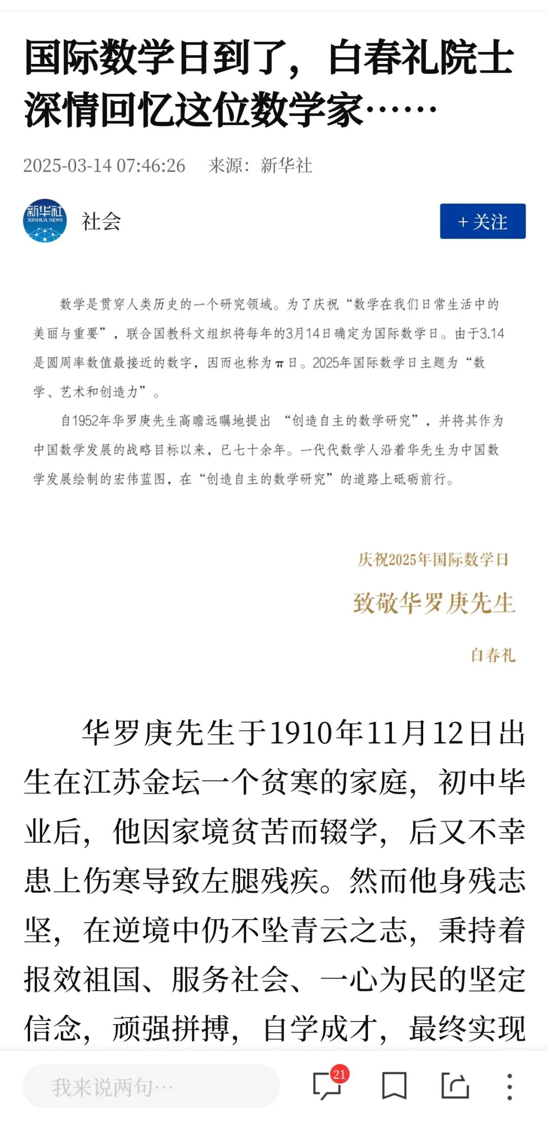 新版問(wèn)世后,白春禮院士在新華社撰文《國(guó)際數(shù)學(xué)日到了,白春禮院士深情回憶這位數(shù)學(xué)家......》力薦本書,獲超150萬(wàn)閱讀量。