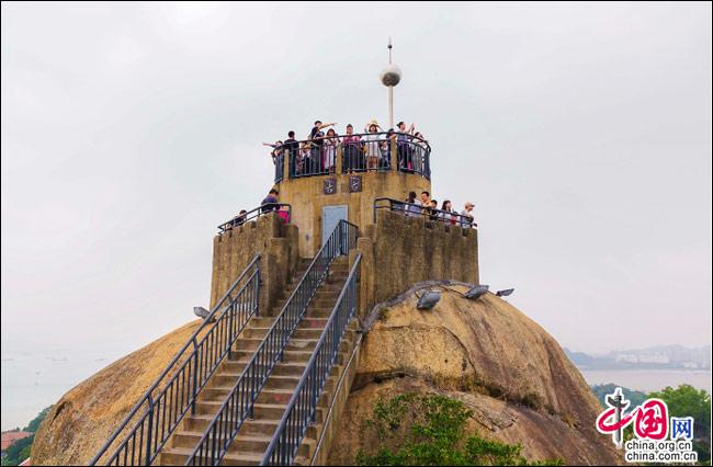 說到自然風(fēng)光,便不能不提日光巖——這島上的最高峰。日光巖別名“晃巖”,相傳1641年,鄭成功來到此地,見此地風(fēng)景勝過吉林日光山,便把“晃”字拆開,稱之為“日光巖”。要登臨此巖,一窺日光,便要辛勞走一段山路。其間渾圓的巨石層出不窮,蒼郁的古樹隨處可見,更有閩南大厝、名人題字與這些自然風(fēng)景相得益彰。于是游人往往在心曠神怡中,路過“九夏生寒”“鷺江龍窟”,經(jīng)由“閩海雄風(fēng)”“古避暑洞”,不知不覺間,來到巖頂?shù)钠脚_(tái)。立定此處,憑欄遠(yuǎn)望,只見輕靈的云天近在咫尺,島上的屋宇盡收眼簾——別提有多么愜意!難怪有詩(shī)人寫道:“一葉輕舟破霧霾,波濤滾滾此登臺(tái)。日光巖上憑欄望,隔岸清風(fēng)過海來。”(陳仁德句)