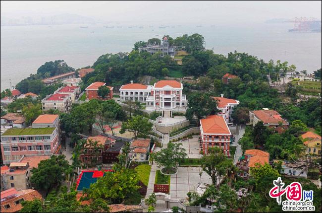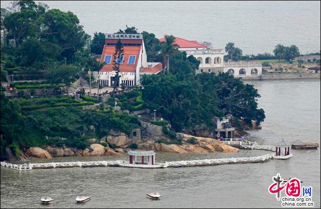 如果有這樣一座島嶼——遠(yuǎn)處是一方寧?kù)o的藍(lán)天,近處是一片幽深的綠樹,藍(lán)與綠之間,是逶迤而去的清水紅磚……極目遠(yuǎn)眺,只見她濃淡相宜、遠(yuǎn)近相安,仿佛一幅肅穆祥和的印象派油畫;細(xì)細(xì)聆聽,似乎還有一支悠揚(yáng)的鋼琴曲,在伴隨海鷗與濤聲,不時(shí)從畫中飄來……
