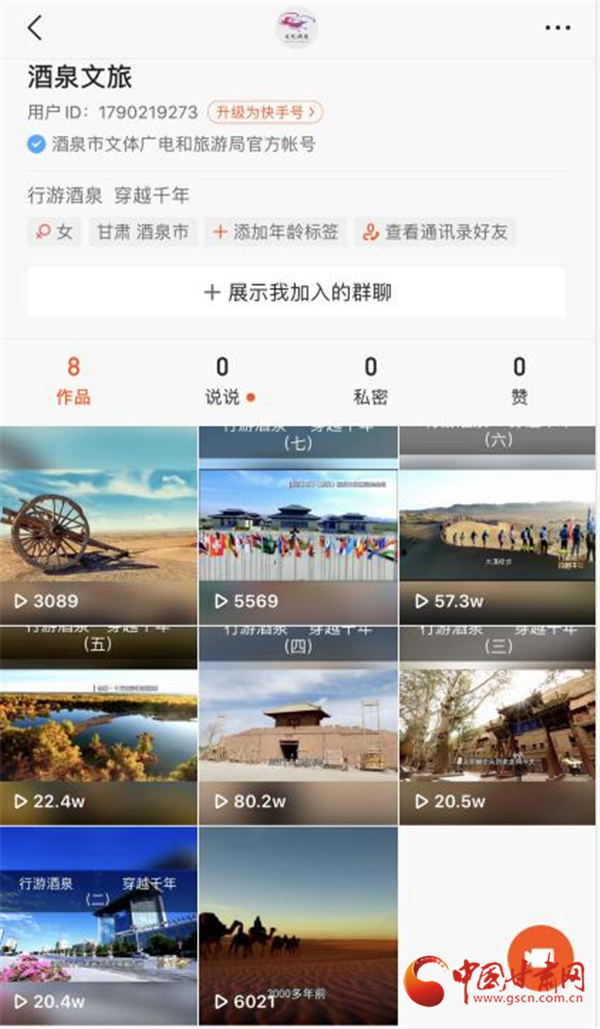 收到通知后,酒泉市文體廣電和旅游局按照省文旅廳要求,迅速開通“酒泉文旅”快手官方賬號,申請注冊了縣(市、區(qū))文旅局、4A級以上景區(qū)、縣(市、區(qū))博物館21家快手大V官方政務(wù)號,推薦上報33位熟悉網(wǎng)絡(luò)傳播規(guī)律、形象素質(zhì)較好的導游、講解員快手大V,組織建立了酒泉文旅快手大V培養(yǎng)隊伍。組織參加省文旅廳開展的線上“甘肅文旅快手大V培訓”,讓更多的景區(qū)景點和博物館的導游、講解員參與其中,把快手平臺作為網(wǎng)絡(luò)宣傳主陣地,積極對外宣傳推介酒泉豐富的文化旅游資源。