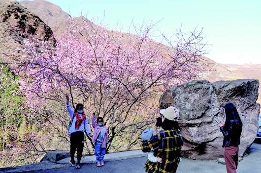3月22日,游客在崆峒后峽賞花拍照。記者  姚志強 攝