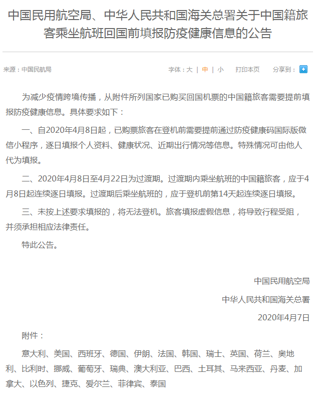 中國民用航空局、中華人民共和國海關(guān)總署4月7日聯(lián)合發(fā)布《關(guān)于中國籍旅客乘坐航班回國前填報防疫健康信息的公告》(以下簡稱《公告》)?!豆妗分赋?,自4月8日起,從意大利、美國、西班牙等26個國家已購買回國機票的中國籍旅客需要在登機前提前填報防疫健康信息,包括逐日填報個人資料、健康狀況、近期出行情況等。旅客未按要求填報的,將無法登機;填報虛假信息,將導致行程受阻,并須承擔相應(yīng)法律責任。