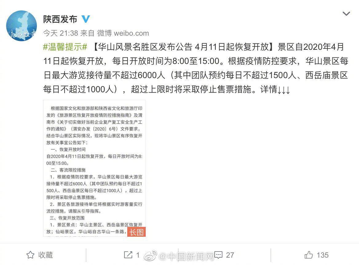 華山風(fēng)景名勝區(qū)4月9日發(fā)布公告,宣布華山風(fēng)景區(qū)4月11日起恢復(fù)開(kāi)放。據(jù)@陜西發(fā)布 華山風(fēng)景名勝區(qū)發(fā)布公告稱(chēng),自2020年4月11日起恢復(fù)開(kāi)放,每日開(kāi)放時(shí)間為8:00至15:00。