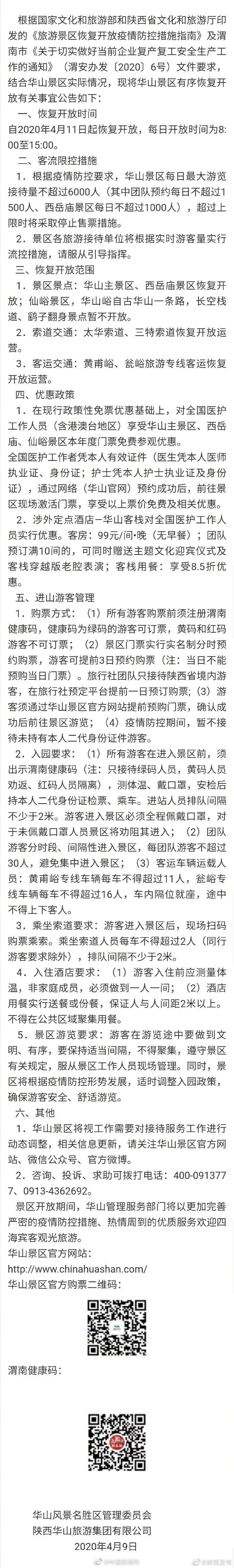 原標(biāo)題:華山風(fēng)景區(qū)11日起恢復(fù)開(kāi)放 對(duì)醫(yī)護(hù)人員免門(mén)票