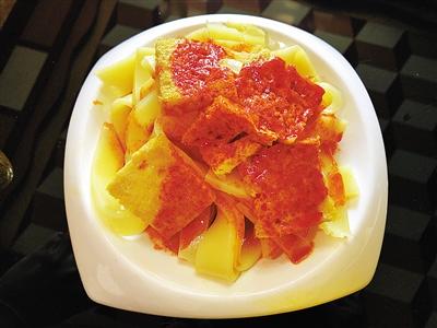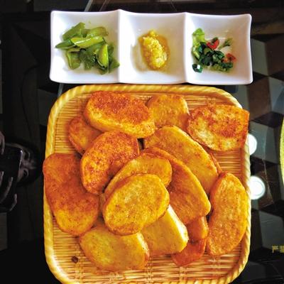 炕鍋洋芋是臨夏農(nóng)家樂里面常見的一道特色小吃,在臨夏,煎、烙之類的烹飪方式都被稱作炕,炕鍋洋芋因此得名。洋芋切片后,直接放熱油中兩面煎透。炕鍋洋芋的做法雖不復(fù)雜,但其對于火候的要求卻極其嚴(yán)苛,多一分會焦,少一分則不熟。