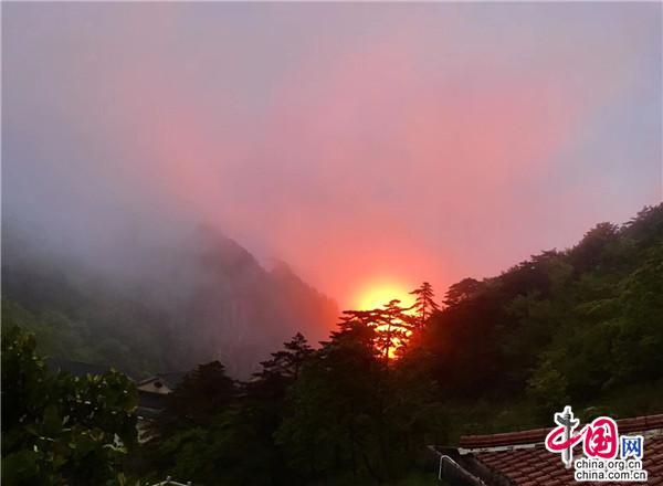 每逢五月,杜鵑花如約而至,用思慮了一冬的巧思把黃山的每一個(gè)角落都裝扮一新,給連綿不絕的山崗披上了五彩的織錦。經(jīng)過(guò)了一冬的蟄伏和等待,杜鵑鉚足了勁兒,花團(tuán)錦簇的熱情如“燃”起的火把,紅透了半邊天。黛青色的遠(yuǎn)山縹緲幽遠(yuǎn),參天的松柏枝繁葉茂,淡而薄的云霧似有還無(wú),杜鵑的姹紫嫣紅給黃山這幅意蘊(yùn)悠長(zhǎng)的水墨畫增添了幾分濃墨重彩,黃山更加靈動(dòng)秀美了。最壯觀的當(dāng)屬日出日落時(shí)分了,天邊的紅霞好似在花枝間流連,墜入花叢般和散落一地的杜鵑相互輝映、渾然一體。