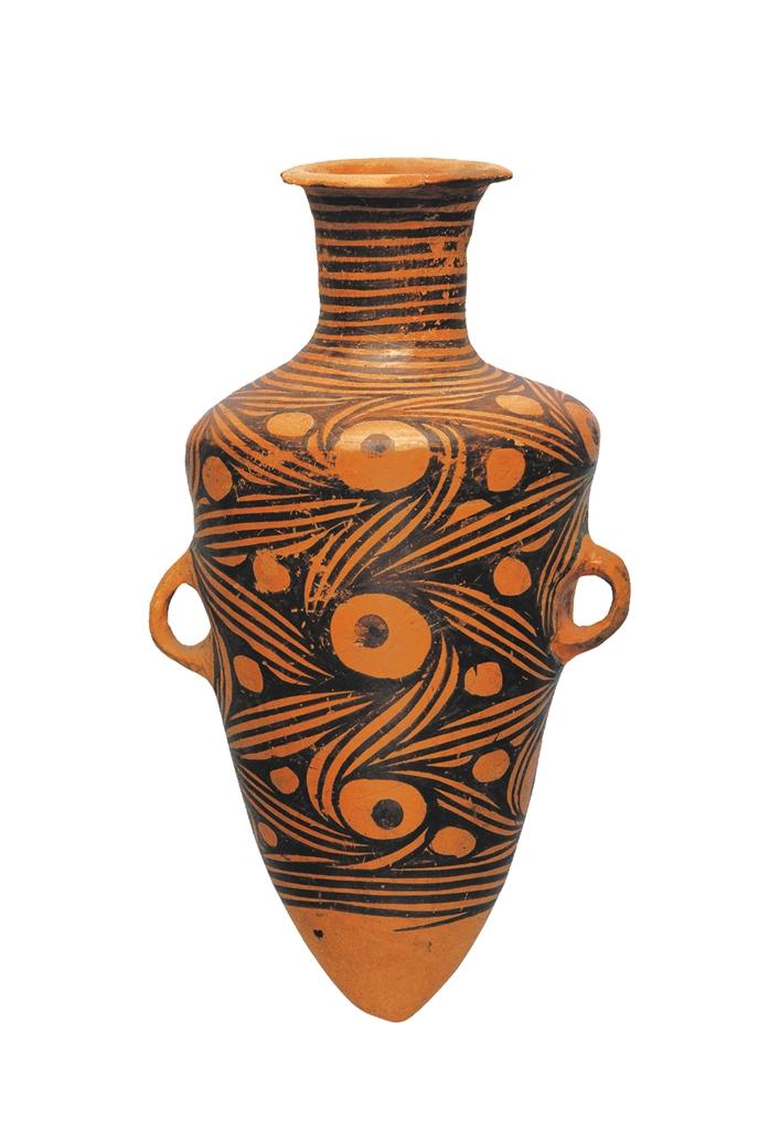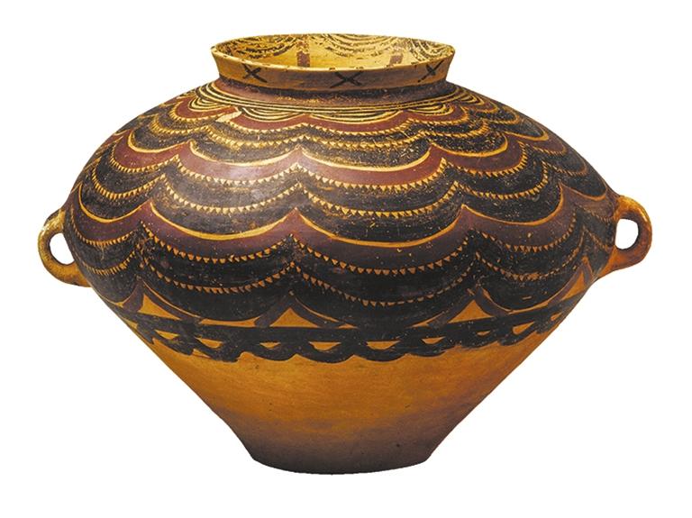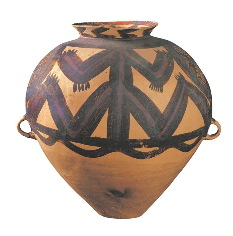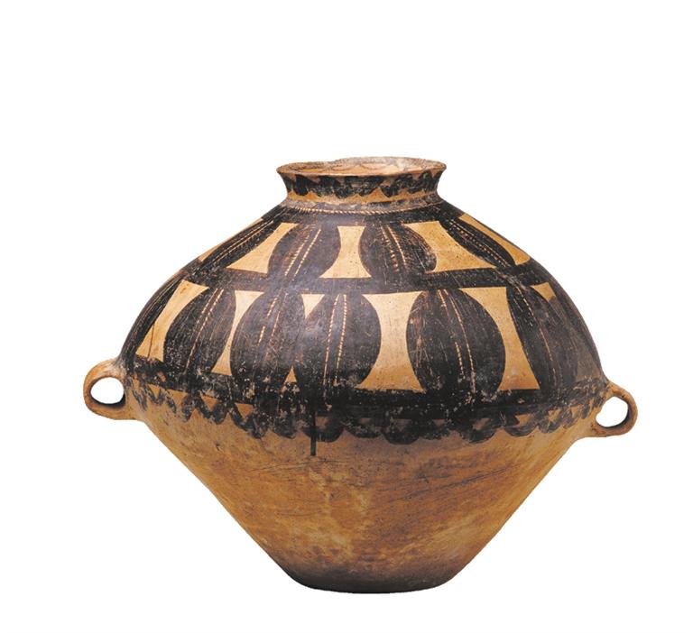 馬家窯文化半山類型(距今約 4500 年),廣河縣地巴坪出土。這是雙耳甕器型大氣貴重,施以紅、黑二彩,紅、黑彩交替使用,腹部繪多層連續(xù)垂弧紋和鋸齒紋,黑、紅彩交替使用,由三組分層連續(xù)的垂弧紋組成整體圖案,每層由兩層黑色帶紋和一層紅色帶紋組成,黑色帶紋上緣繪向上的鋸齒紋。整個(gè)圖案密集繁復(fù),俯視猶如一朵盛開(kāi)的鮮花,造型豐滿,色彩鮮艷。