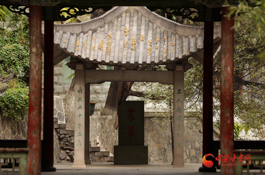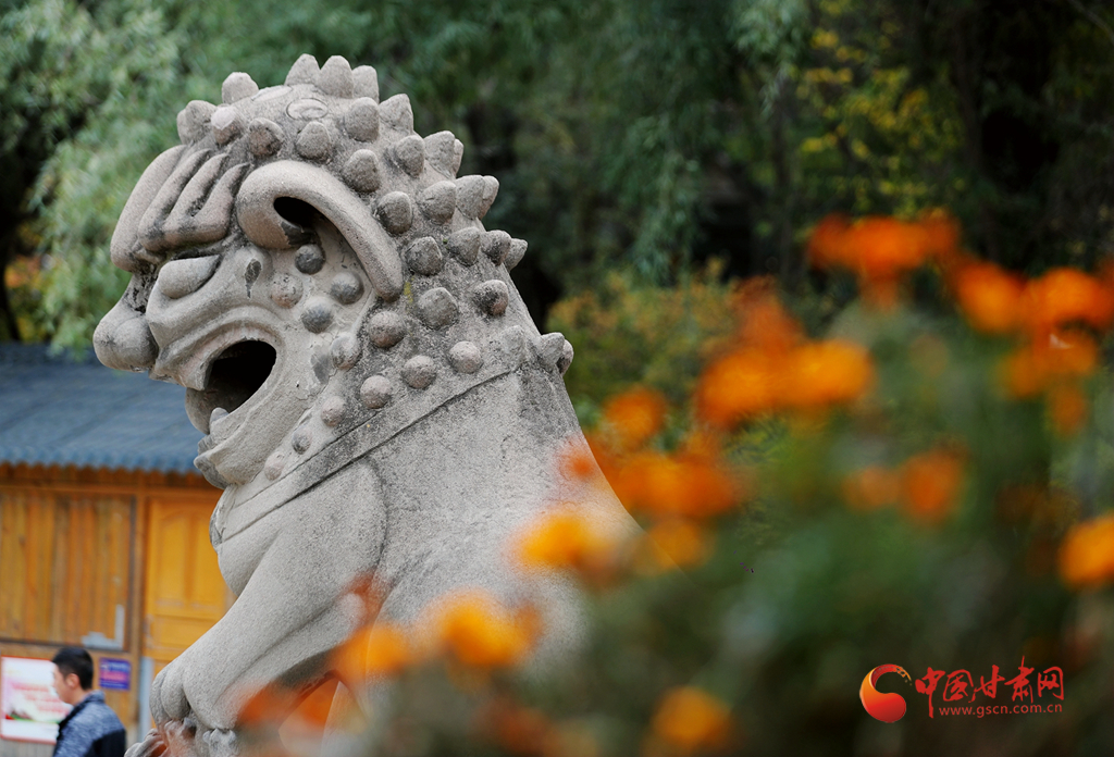 秋天,石獅子和金黃色構(gòu)成五泉山的一道景致。