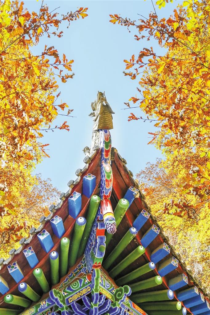 在秋天,興隆山不只有紅葉,與青岡樹(shù)相伴的還有山楊落葉松和樺樹(shù),它們的枝頭像棲滿了黃蝶。一片片野山楊,在初陽(yáng)的照耀下,純粹的本色的黃,如波浪流動(dòng),漫過(guò)一道道山脊,充盈一處處山彎。一片片白樺林,也是那么衷情,帶些褐色的黃在蒼翠的松柏云杉間,同掩映在峰巒間寺院道觀的翹角飛檐色調(diào)完全一致,格外讓人留戀。