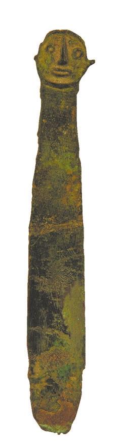 相比刀與叉,匕的出現(xiàn)要稍晚一些,甘肅省博物館收藏有人頭柄銅匕兩把,都是辛店文化(距今3400年—2800年)的產(chǎn)物,兩把人頭柄銅匕都采集于甘肅省廣河縣。一把人頭柄銅匕造型比較拙樸,匕身平直呈長(zhǎng)舌狀,末端為圓弧形并微上翹。柄首為人頭形,高鼻,圓眼,厚唇微張,半環(huán)形雙耳,一耳殘缺。另一把人首柄銅匕同前一把人頭柄銅匕造型相似,但做工卻要精美許多,這把銅匕柄首也是人頭形,高鼻,圓眼,圓口,雙耳為半環(huán)形,頸部涂紅色,身體為方格網(wǎng)紋。這把人頭柄的人面雙目圓睜,嘴微張,一副機(jī)靈驚詫的表情,比前一把人頭柄銅匕人面憨直質(zhì)樸的面目更有意趣。這是兩把還沒(méi)成為武器的銅匕,但它已經(jīng)有了勺子的雛形。