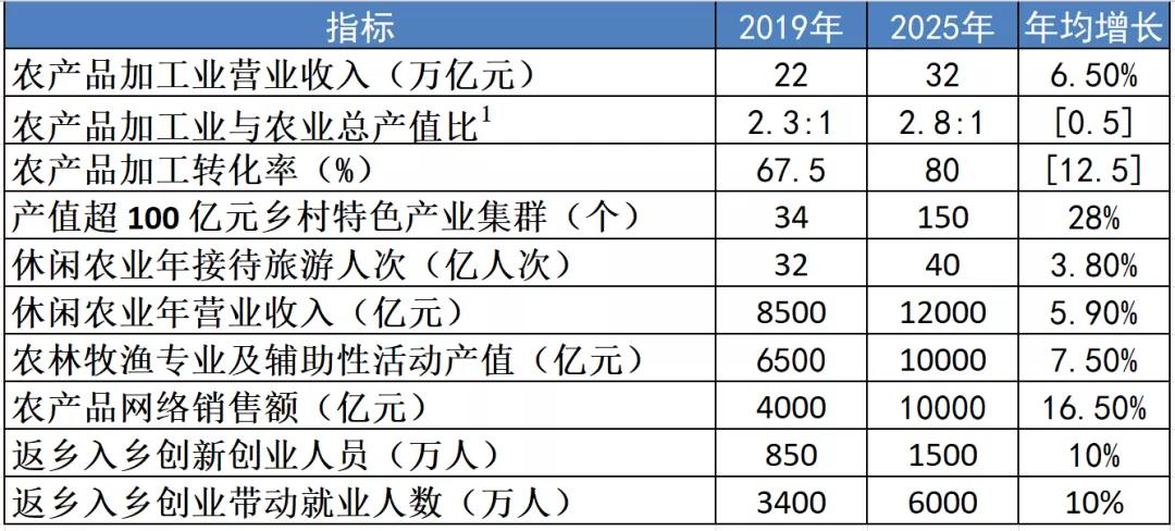 到 2025 年,鄉(xiāng)村產業(yè)體系健全完備,鄉(xiāng)村產業(yè)質量效益明顯提升,鄉(xiāng)村就業(yè)結構更加優(yōu)化,產業(yè)融合發(fā)展水平顯著提高,農民增收渠道持續(xù)拓寬,鄉(xiāng)村產業(yè)發(fā)展內生動力持續(xù)增強。