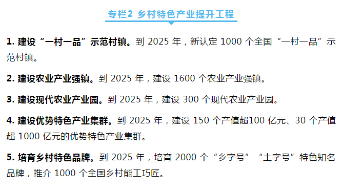 ——鄉(xiāng)村特色產業(yè)深度拓展。培育一批產值超百億元、千億元優(yōu)勢特色產業(yè)集群,建設一批產值超十億元農業(yè)產業(yè)鎮(zhèn)(鄉(xiāng)),創(chuàng)響一批“鄉(xiāng)字號”“土字號”鄉(xiāng)土品牌。