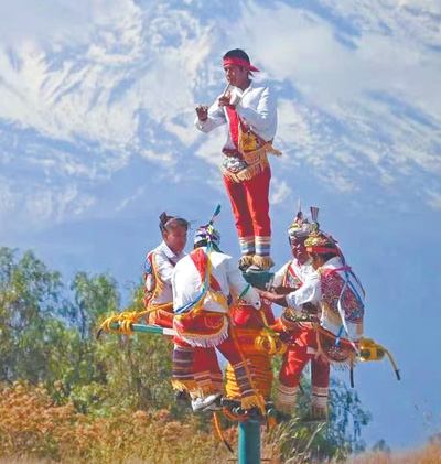 這些舞者表演的是墨西哥傳統(tǒng)的“飛天舞”儀式。“飛天舞”在墨西哥韋拉克魯斯州的托托納克人中盛行,現(xiàn)已成為該州帕潘特拉市代表性的文化標志。2009年,這項民間技藝被聯(lián)合國教科文組織列入人類非物質文化遺產代表作名錄。