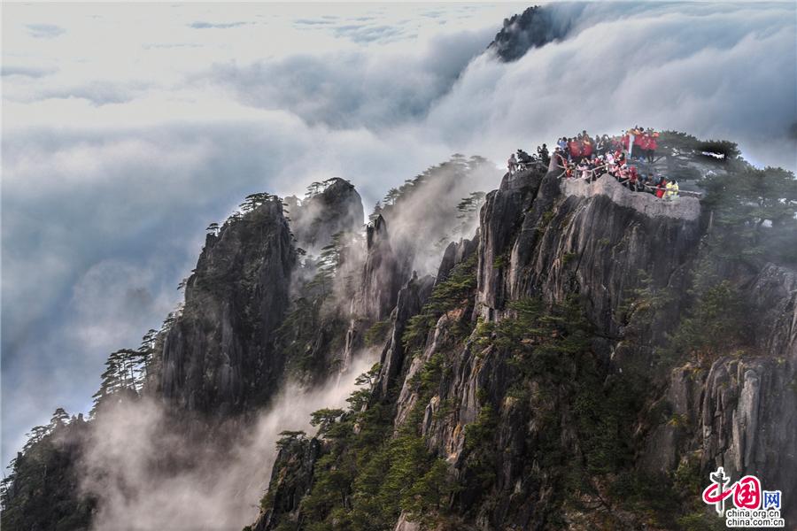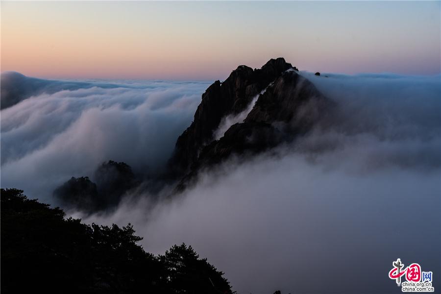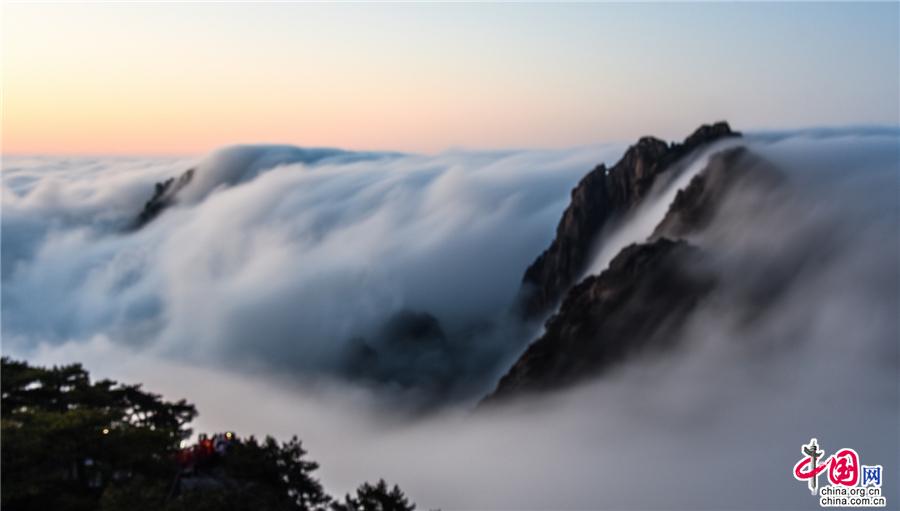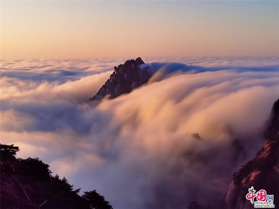 凌晨,當(dāng)云海隨著氣流漫過(guò)天都峰與蓮花峰時(shí)瘋狂的傾瀉而下,浩浩蕩蕩直奔東方注入大海,成就浩瀚的海洋。