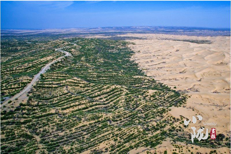 壓沙播綠,人進(jìn)沙退。40年來,民勤縣以流沙治理為重點(diǎn),累計(jì)完成工程壓沙131.2萬畝,人工造林313.53萬畝。