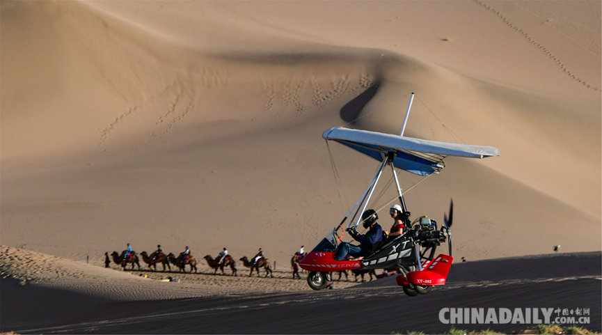 5月6日,游客乘坐滑翔機從空中鳥瞰敦煌大漠風(fēng)光。
