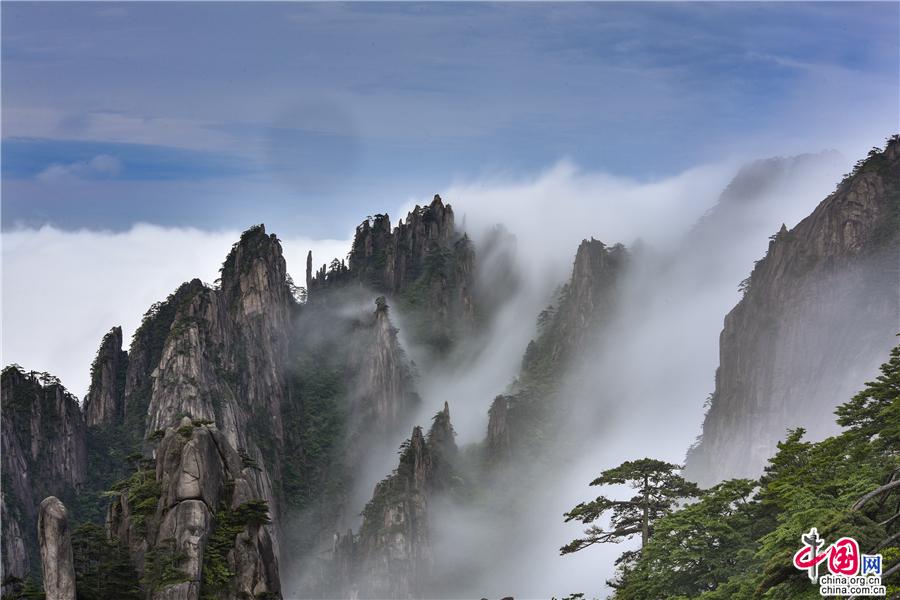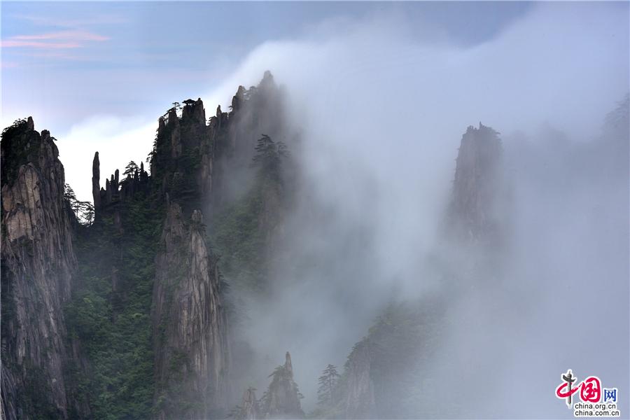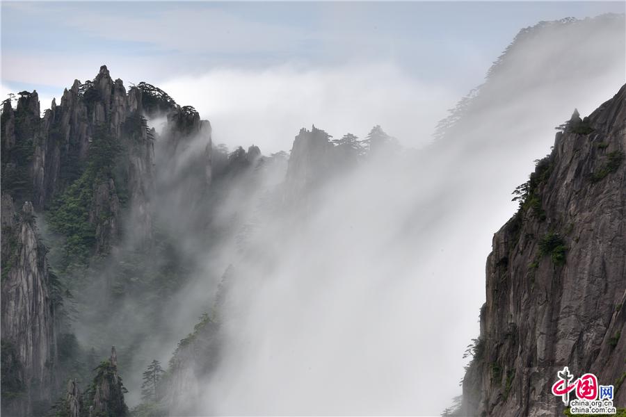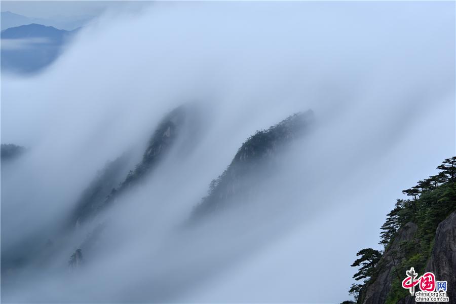 5月22日傍晚,雨后安徽黃山風(fēng)景區(qū)現(xiàn)壯觀的云海奇觀,見(jiàn)云海奔騰而來(lái),越過(guò)北海的始信峰,沿著群峰傾瀉而下勢(shì)如瀑布之壯觀,在奇群、怪石和形態(tài)各異黃山松的作用下勾勒出一幅幅流動(dòng)的水墨畫(huà);黃山不僅是云霧之鄉(xiāng),更是中國(guó)傳統(tǒng)水墨畫(huà)的天然的素材。(姚育青)