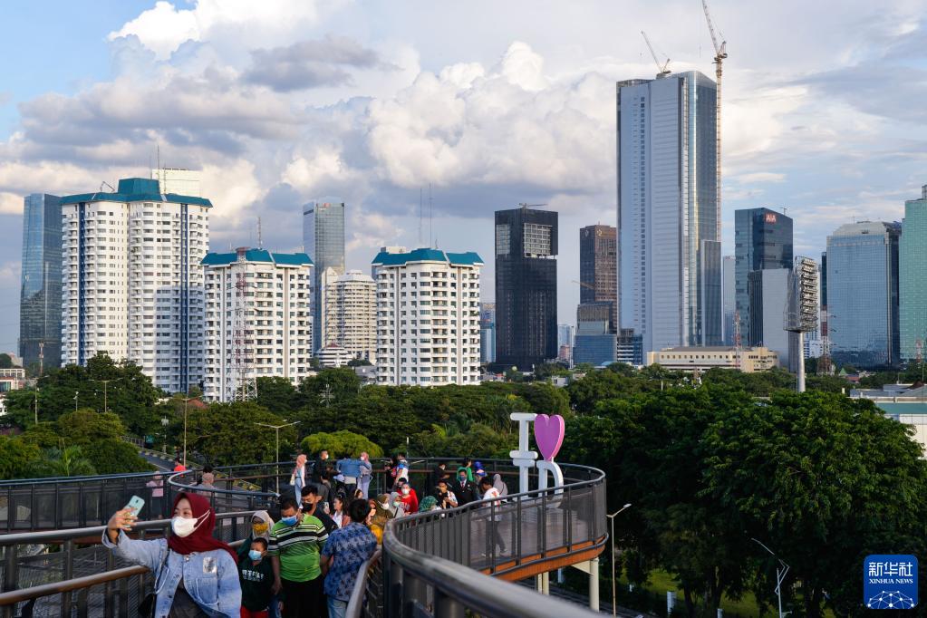 1月23日,人們在印度尼西亞雅加達(dá)史納延公園的空中步道欣賞城市風(fēng)光。