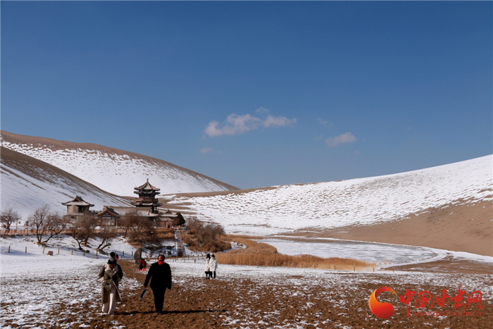雪后的甘肅省敦煌市鳴沙山月牙泉景區(qū)景色如畫(huà)、銀裝素裹,美不勝收。