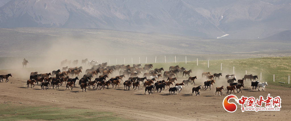 夏日,位于祁連山北麓的甘肅張掖山丹馬場綠草如茵,牧馬人揚鞭催馬,山丹馬場再現(xiàn)萬馬奔騰景象。