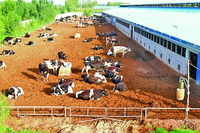 張掖市高臺縣巷道鎮(zhèn)東聯(lián)村的奶牛養(yǎng)殖場 藺鵬攝/光明圖片
