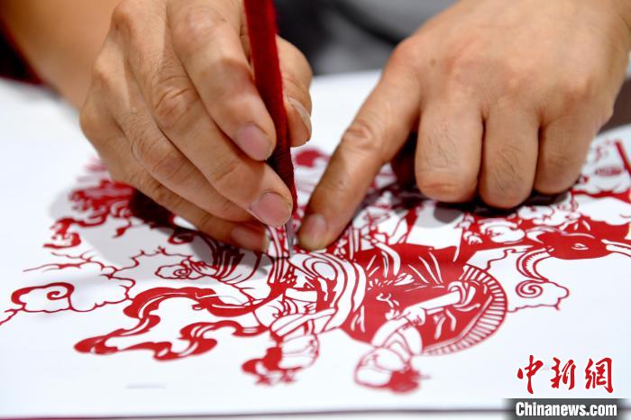尤金水在剪刻《鵲橋相會》剪紙作品 苗鳳強 攝