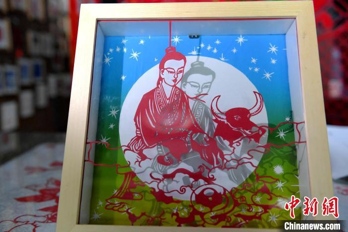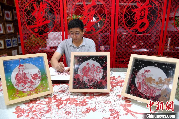 8月4日,是中國傳統節(jié)日七夕節(jié)。河北省衡水市阜城縣剪紙藝人尤金水創(chuàng)作了《牛郎》《織女》《鵲橋相會》三幅“七夕”剪紙作品,傳遞千年浪漫情。據介紹,作品采用阜城剪紙陽刻的手法,裝裱后利用立體投影的方式,可以把畫面投影到“月亮”上,既浪漫又神奇。