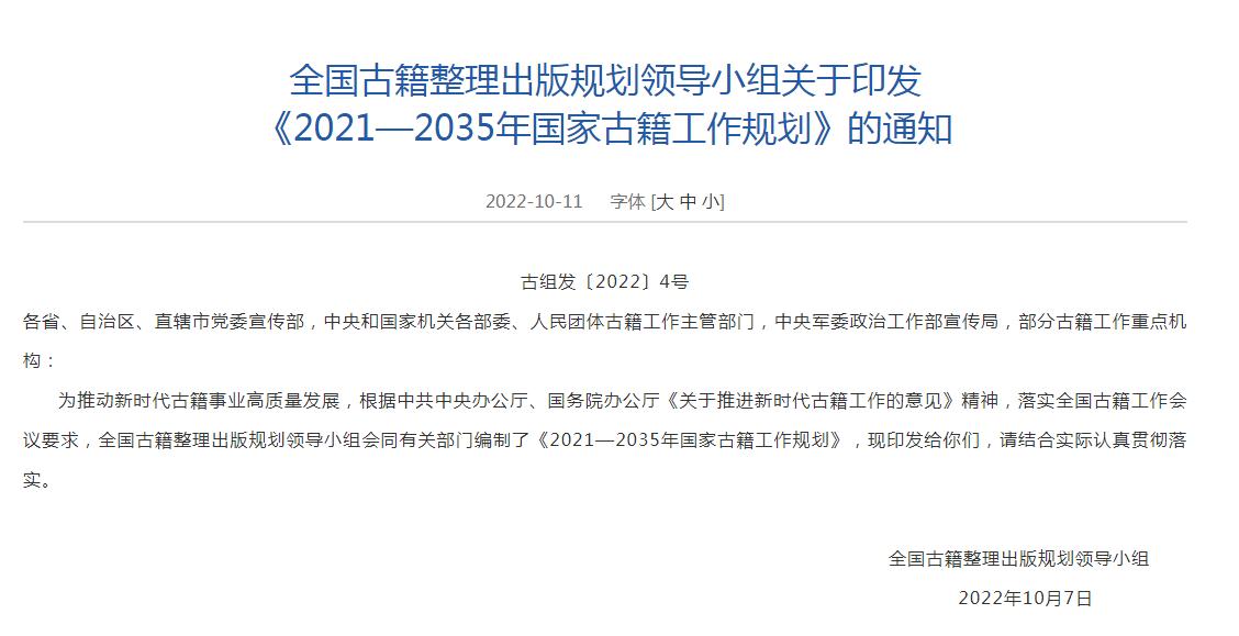 根據(jù)規(guī)劃,到2035年,古籍工作體制機制更加完善,標準規(guī)范體系基本健全,古籍保護、 整理研究和編輯出版成果豐碩,質量明顯提升,古籍數(shù)字化資源建設取得重要進展, 古籍普及深入推進,人才隊伍發(fā)展壯大,古籍工作在傳承和弘揚中華優(yōu)秀傳統(tǒng)文化中的作用更加突出。