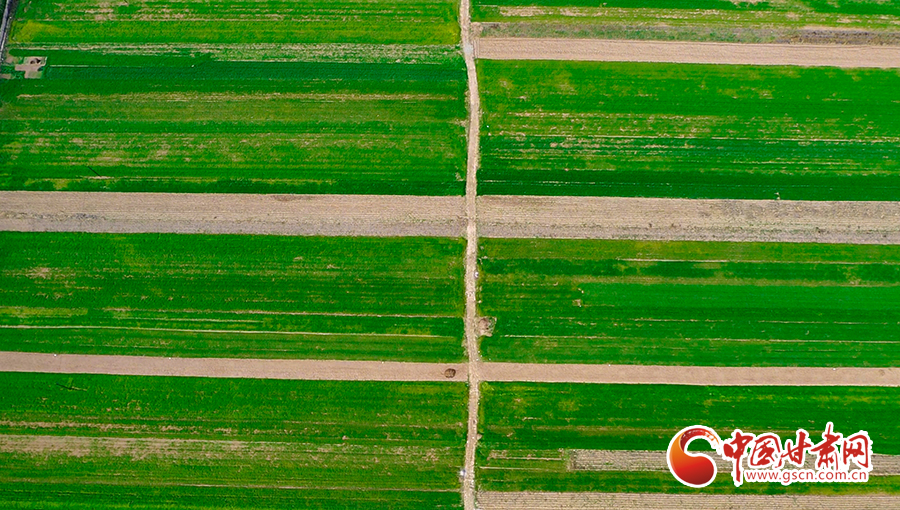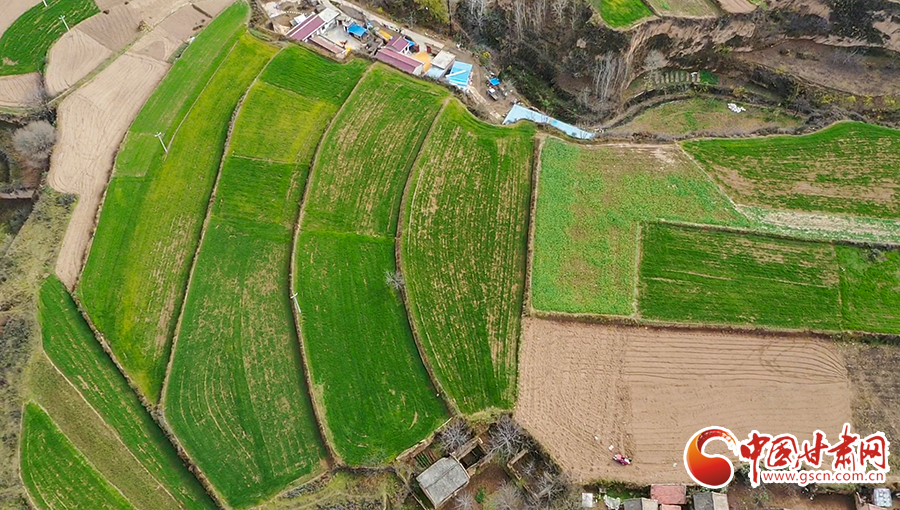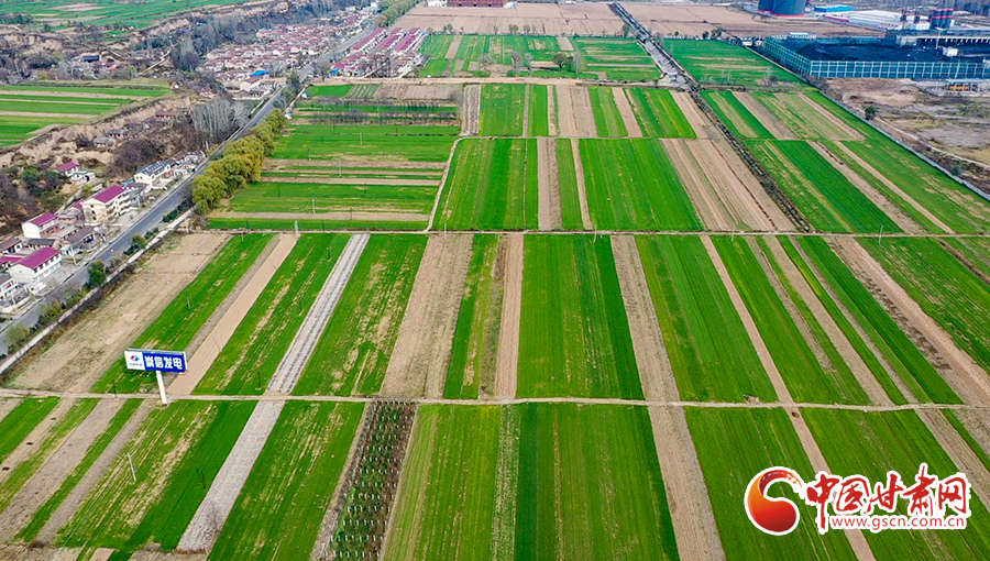 初冬時(shí)節(jié),平?jīng)鍪谐缧趴h錦屏鎮(zhèn)農(nóng)田里冬小麥長勢喜人,從空中俯瞰,給田野鋪上了綠色的地毯。