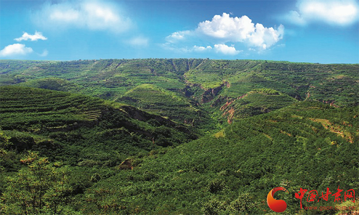 站在田家溝梁峁山巔望去,一路向北沿著蜿蜒的山道,一幅偌大的山水畫(huà)呈現(xiàn)在眼前。藍(lán)天白云下,青山綠水、林苑疊嶂。