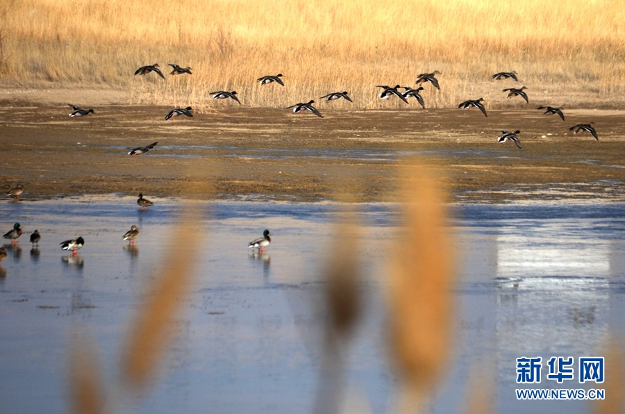 初冬時(shí)節(jié),位于鳴沙山下的甘肅省敦煌市黨河濕地,白鷺、綠頭鴨、赤麻鴨、灰雁等候鳥在這里棲息、飛翔、覓食,構(gòu)成了一幅和諧美麗的生態(tài)畫卷。