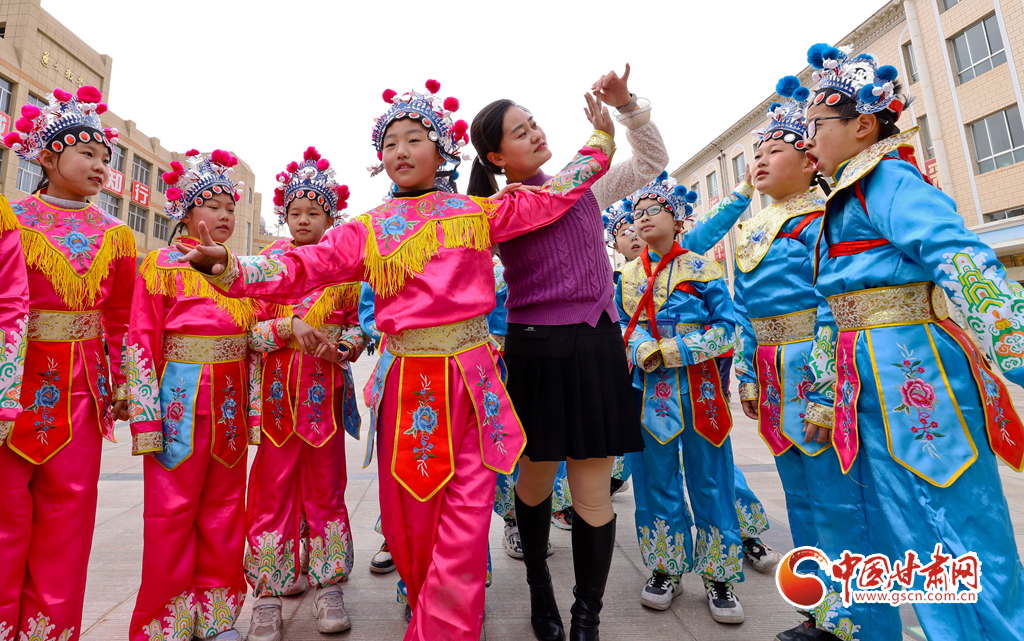3月22日,在甘肅省張掖市民樂縣洪水小學(xué),戲曲演員正在給同學(xué)們指導(dǎo)戲曲動作、傳授唱腔。