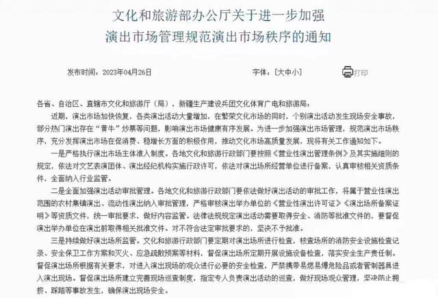 近日,文旅部辦公廳發(fā)布《文化和旅游部辦公廳關(guān)于進(jìn)一步加強(qiáng)演出市場管理規(guī)范演出市場秩序的通知》。通知提到,對臨時(shí)搭建舞臺、看臺的演唱會、音樂節(jié)等大型演出活動,文化和旅游行政部門要做好演出現(xiàn)場監(jiān)管,查驗(yàn)演出舉辦單位的演出批準(zhǔn)文件及相關(guān)手續(xù),核驗(yàn)演員信息及演出節(jié)目內(nèi)容,嚴(yán)禁擅自變更演員及演出內(nèi)容,嚴(yán)禁假唱、假演奏等違法違規(guī)行為。