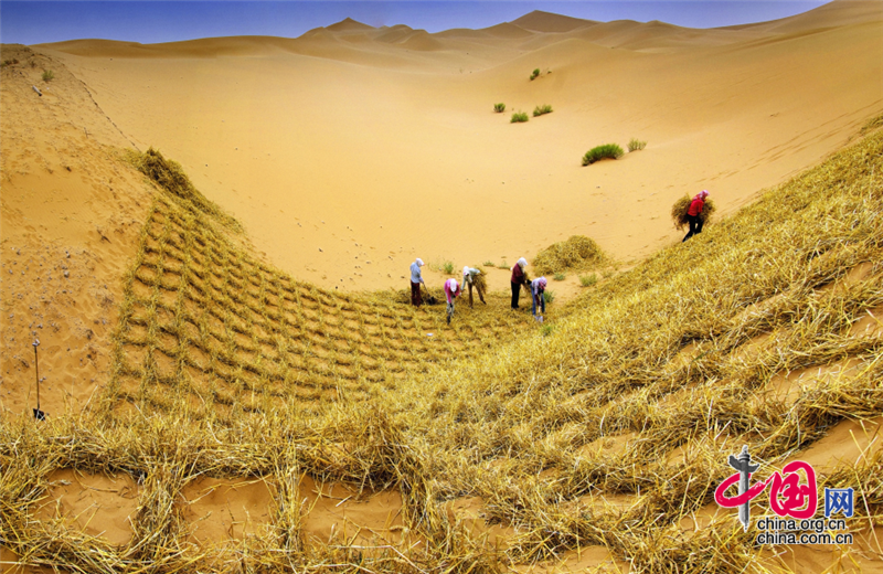 小小的“麥草方格”不僅阻止了流沙,防止了荒漠化,還加速了當地經濟的發(fā)展。“麥草方格”固沙法即:將廢棄的麥草呈方格狀鋪在沙面上,然后用鐵鍬軋進沙中,留麥草的三分之一或一半立在四周,并在方格中植入治沙人經九次試驗成功培育出的花棒、檸條等沙生植物,腐爛干枯的麥草還作為肥料滋養(yǎng)植物的生長。