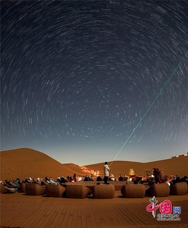 在沙漠區(qū),游客晨觀大漠日出,昏賞沙海夕陽,夜晚宿在星星酒店,感受躺在床上看星星的奇妙體驗,在星咖啡手工制作星星原木版畫,在五行沙療室滋養(yǎng)生命的每一個細胞,在觀星谷跟著星空講師春看獅子座、夏觀銀河、秋尋仙女座、冬追獵戶座,期待與一場流星雨的不期而遇。