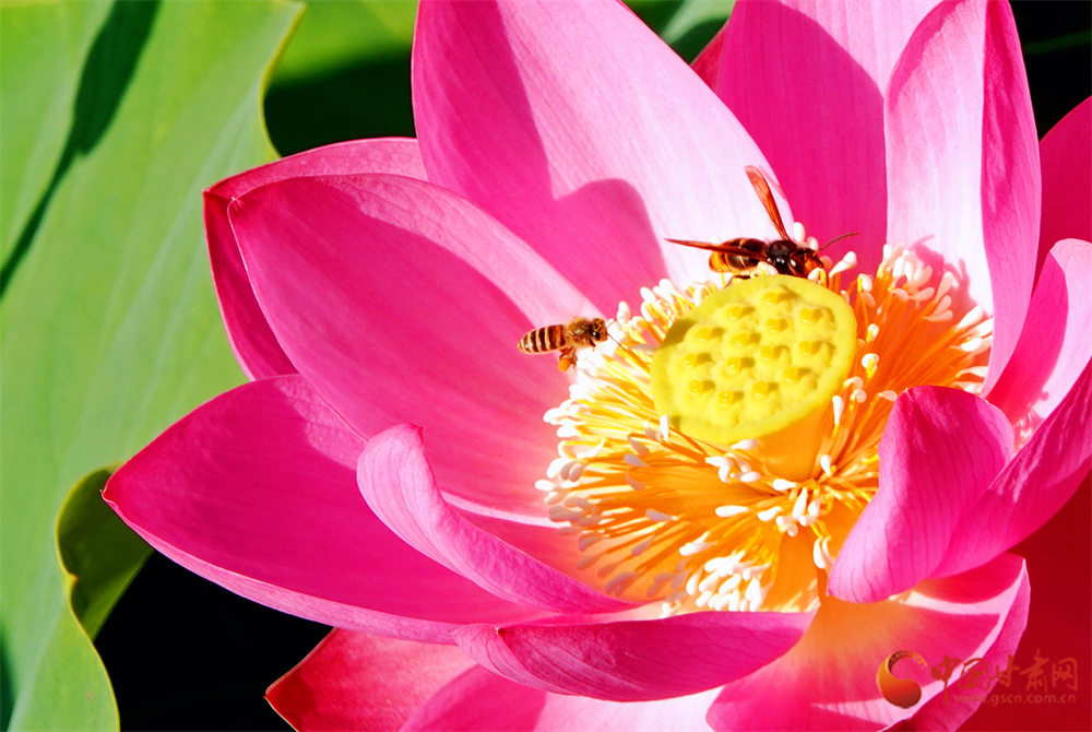 偶有蜜蜂立于荷花枝頭,在陽光下展現(xiàn)出別樣風(fēng)采