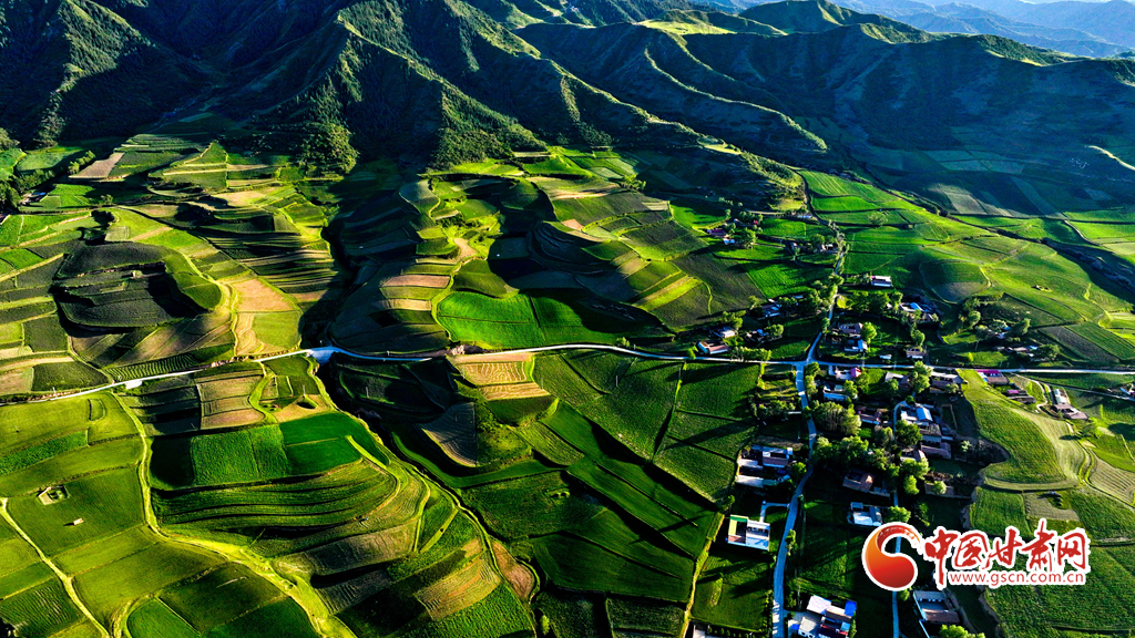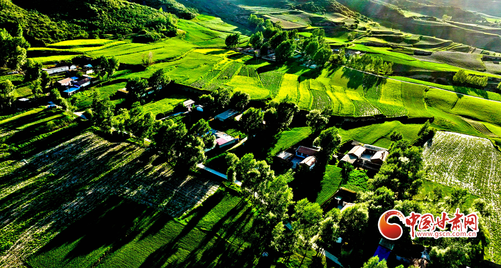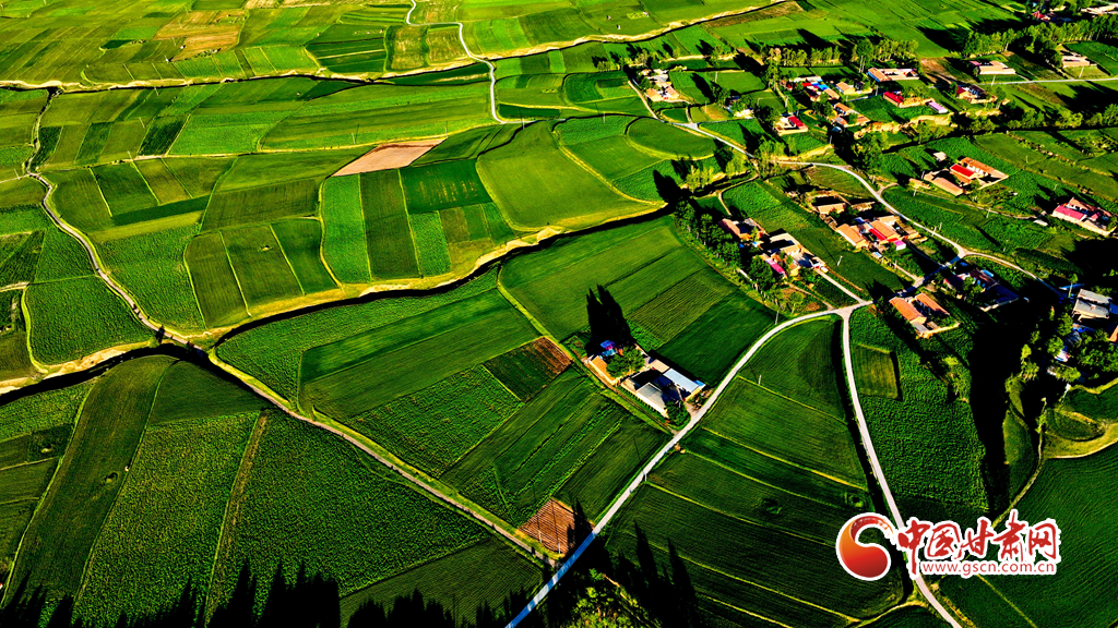 夕陽映襯下的祁連山北民樂縣豐樂鎮(zhèn)易家灣村,綠油油的莊稼生長旺盛,林木蓊郁層林盡翠,呈現(xiàn)出生機(jī)勃勃的景象,猶如“巨幅綠毯”。