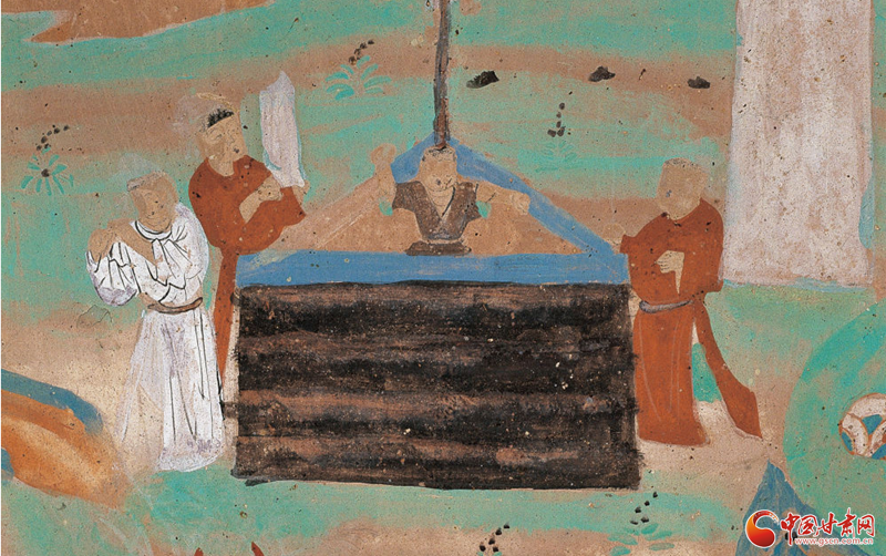 在宋代第55窟東壁門(mén)南側(cè)的金光明經(jīng)變右側(cè),有一幅壁畫(huà),從上到下,將一個(gè)“流水長(zhǎng)者子救魚(yú)”故事娓娓道來(lái)。