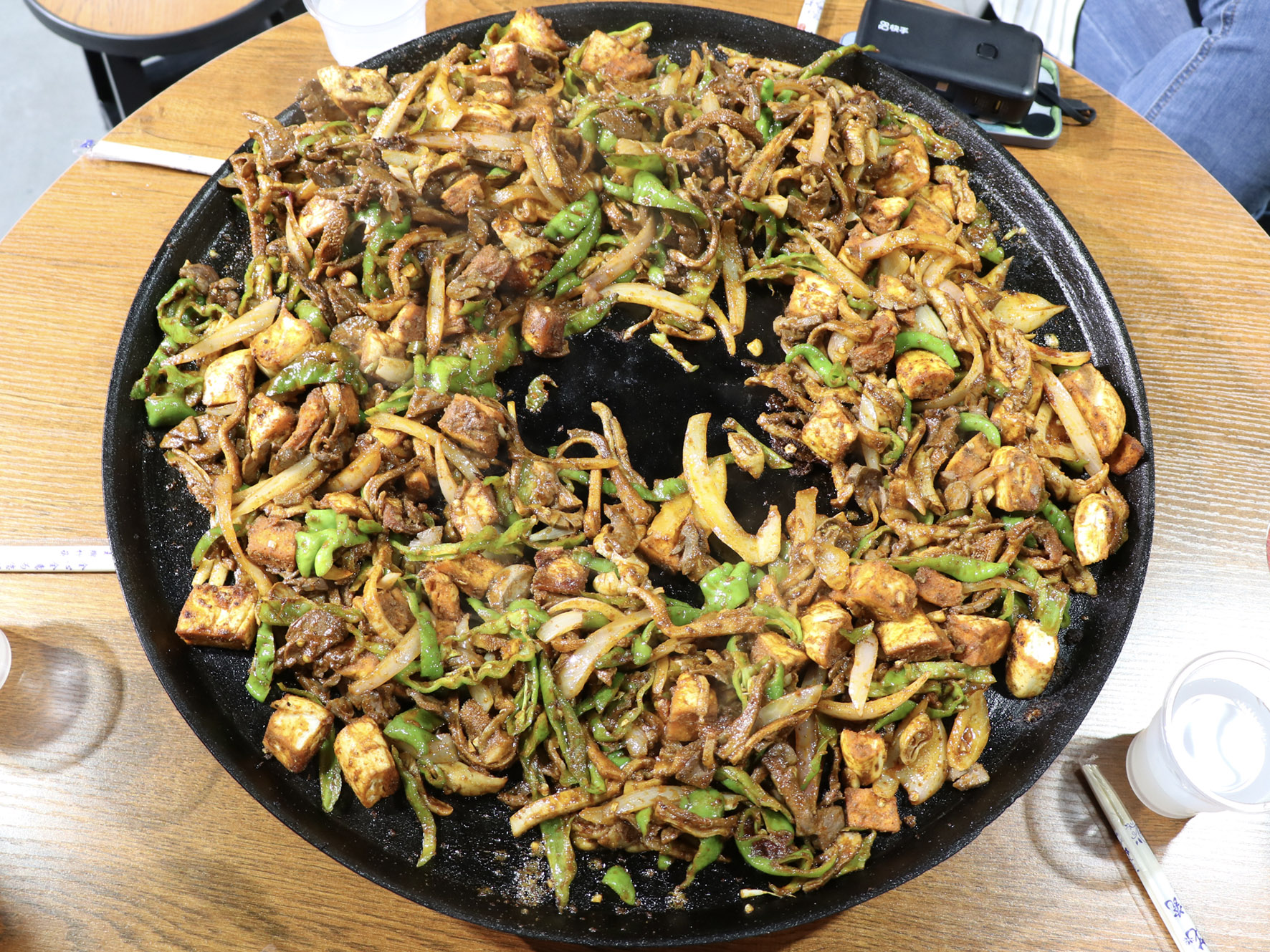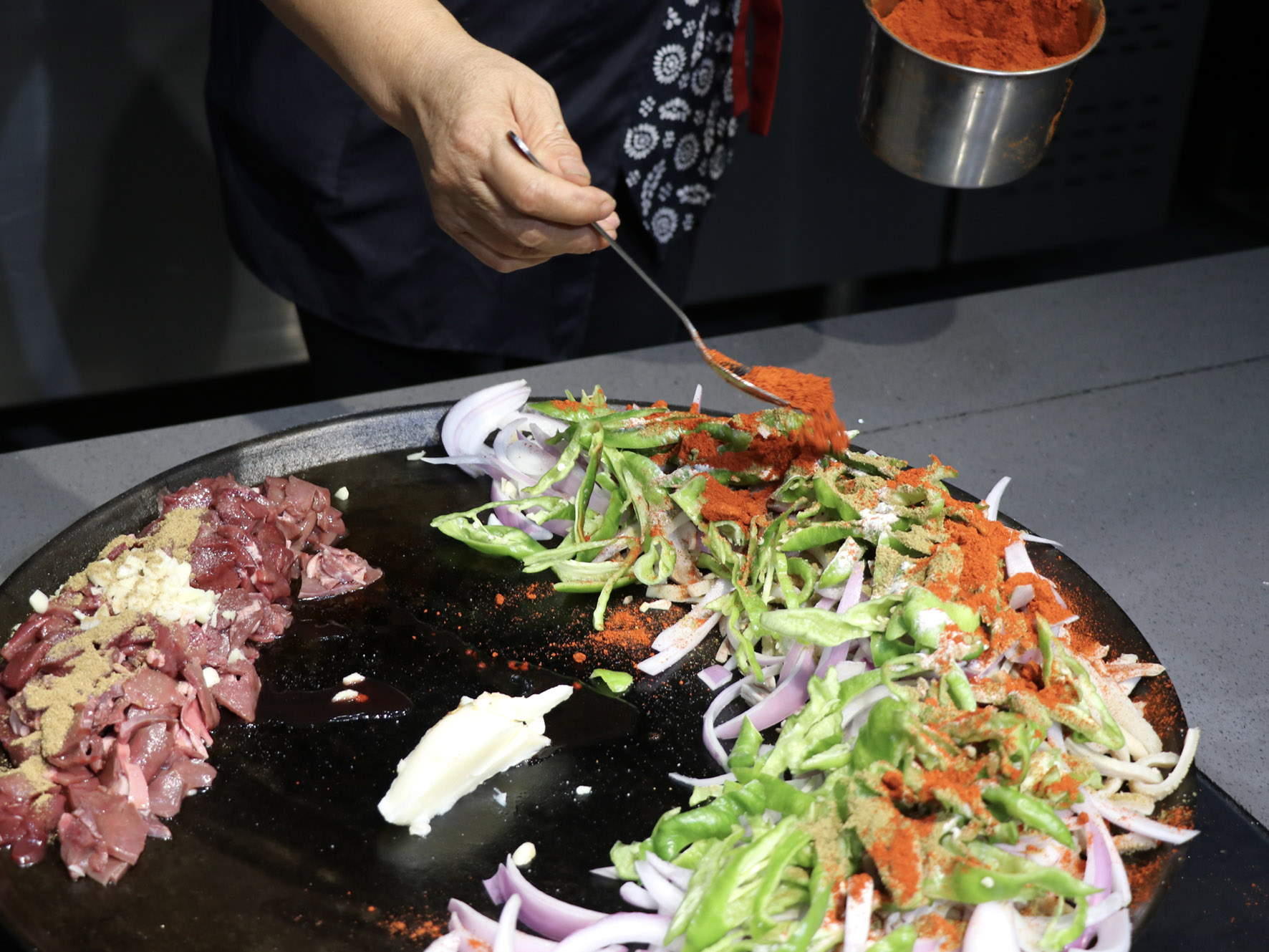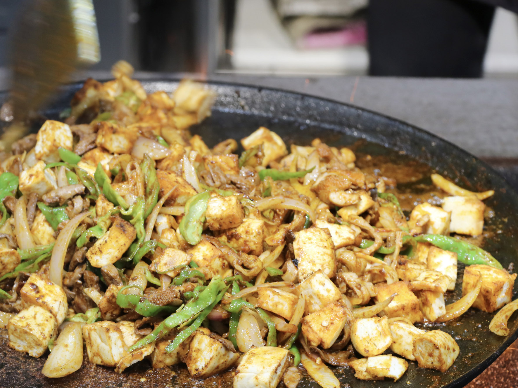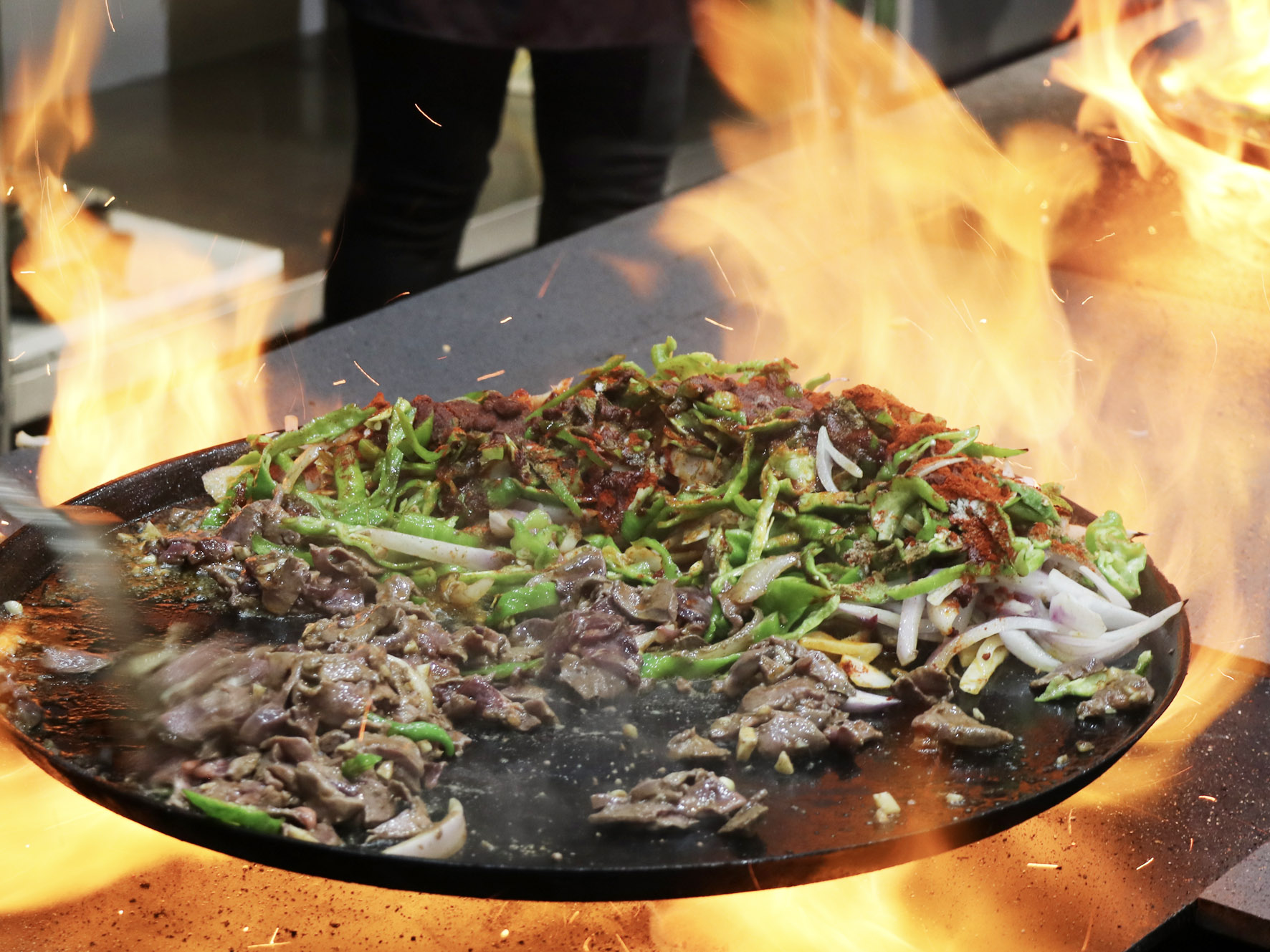 最美味的食物往往來自于最樸素的食材,只見店家將切好的羊肝、肺、肚、腸、心等佐以洋蔥、青椒下入一個鑄鐵鏊子里,再加上幾勺鹽和辣椒面,開始用猛火爆炒,火星四濺,一頓撥拉之后,待到七分熟左右再放入提前準備好的白餅塊一起翻炒即可。