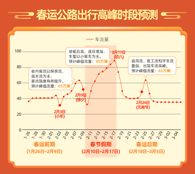 春節(jié)假期(2月10日至2月17日):預(yù)計2月10日(正月初一)車流將明顯回落,從2月11日至13日(正月初二至正月初四)拜年聚會、短途自駕出行車流較集中,出現(xiàn)短途出行小流量;2月17日假期最后一天(正月初八)出現(xiàn)返程高峰,13點至17點環(huán)蘭路網(wǎng)部分路段將出現(xiàn)區(qū)域性擁堵。