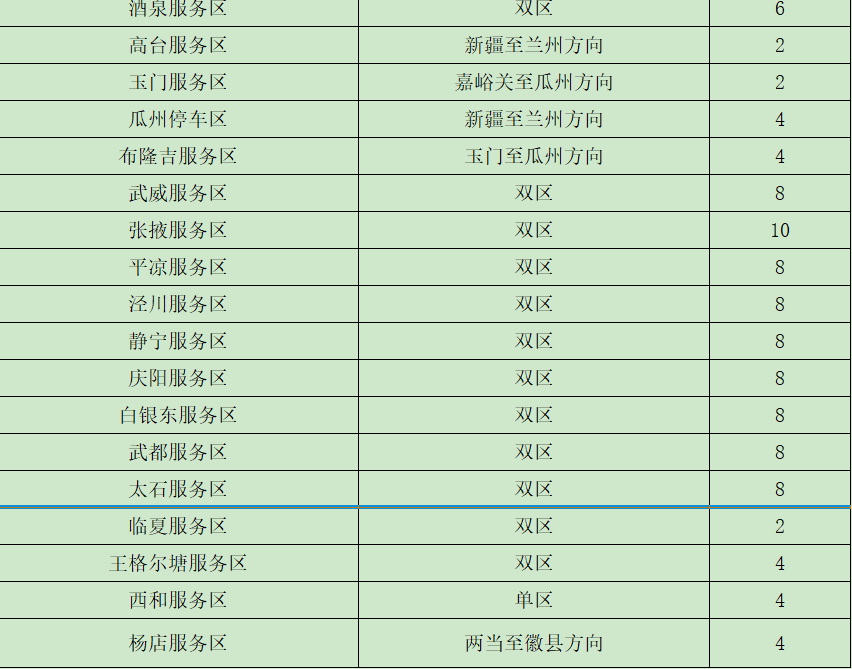 ?。ǘ┲攸c客運(yùn)車站班線。省內(nèi)二級及以上客運(yùn)站正常營運(yùn),以省會城市、人口密集市縣的站點及之間的班線為重點。如:蘭州客運(yùn)東站、南站,天水汽車站等站點以及蘭州—定西、蘭州—西峰、臨洮—平川、舟曲—武都、金昌—武威等客運(yùn)班線。 (三)車流量較大服務(wù)區(qū)。預(yù)計我省車流量較大服務(wù)區(qū)為定西服務(wù)區(qū)、酒泉服務(wù)區(qū)、武威服務(wù)區(qū)、高臺服務(wù)區(qū)、長城驛服務(wù)區(qū)、靜寧服務(wù)區(qū)、會寧服務(wù)區(qū)、太石服務(wù)區(qū)、蘭州北服務(wù)區(qū)、接駕嘴服務(wù)區(qū)、永登服務(wù)區(qū)。